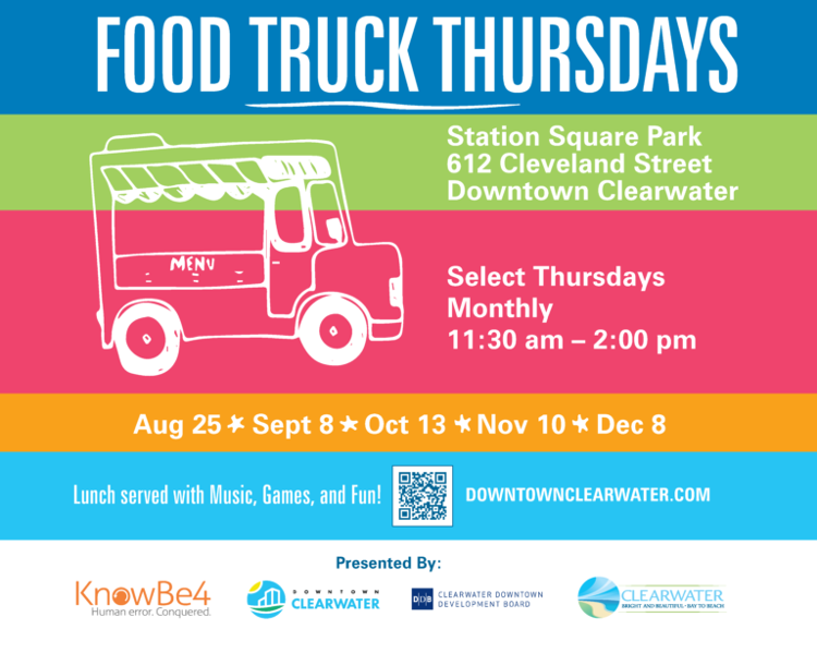 The Community Redevelopment Agency and Downtown Development Board have partnered with Clearwater-based cybersecurity training firm KnowBe4 to launch the new Food Truck Thursdays event. The first in the series is 11:30 a.m.- 2 p.m. this Thursday, August 25, at Station Square Park, 612 Cleveland St. Sea Dog Cantina is the featured food truck and the event has games and a DJ playing music. The future schedule is September 8, October 13, November 10 and December 8, with a different themed food truck each month.Â