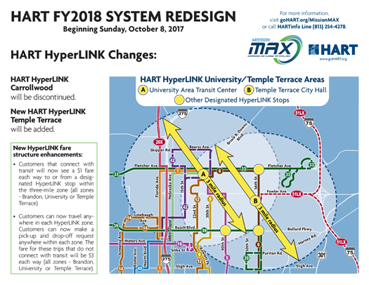 HART will be relying on and expanding where possible its Hyperlink services, the country’s first transit-operated rideshare service providing door-to-door service, connecting riders with existing bus lines on demand. HARTPlus will continue to serve the handicapped within three quarters of a mile from the old routes.
