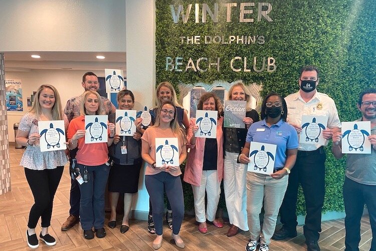 Courtesy of Ocean Allies – Winter the Dolphin’s Beach Club staff celebrating their status as an Ocean Friendly certified business.