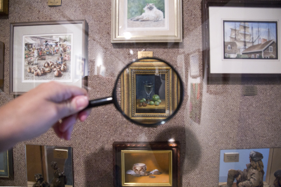 “There have been all these wonderful people that support the arts, supported my work and other artists work, and we have a call to artists that we put out into the community. … Then once a month we have a new gallery show.” The resulting shows at the gallery coincided with the 2nd Friday Dunedin Wine/Art Walk where a $10 wrist band gives you access to wine tasting, art appreciating, and other special offers and giveaways at studios and shops around town. Before leaving the Stirling galleries, make sure to grab the magnifying glass hanging on the wall and check out the tiny masterpieces of the permanent art collection of the Miniature Art Society of Florida.