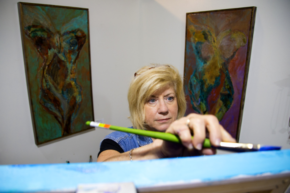 Today a metalsmithing and jewelry making class sends the pinging of tiny hammers piercing through the studio walls of painter Wendy Davis until it resembles the sound of Morse code by the time it penetrates the workspace of Vincenti Studios. The rhythmic treble meets the coarse overtures of extravagant brushstrokes working bright blue paint into the canvas by Laura J. Vincenti. Vincenti and her husband Len moved into the space earlier this year and she says it’s a combination of community support and a constant flow of new art that has made the art scene in Dunedin so successful.