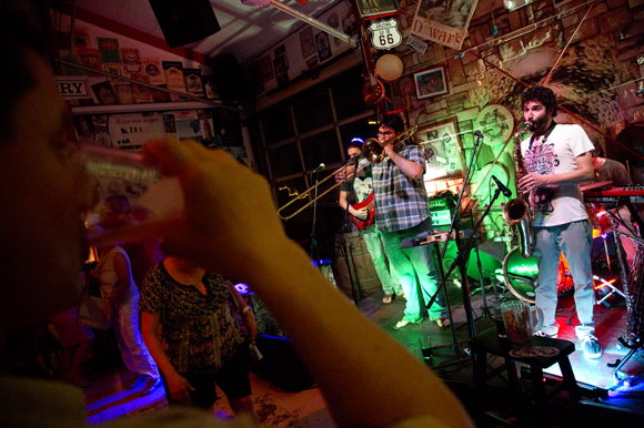 Tonight a blaring trombone and saxophone fill the large main room, which is a mix of the brewhouse and industrial garage. The band Public Sounds Collective is funky enough for patrons to put down their craft brews and break out some dance moves, but if the music is a little much, the back patio has a backyard feel popular with the doggie-loving crowd.