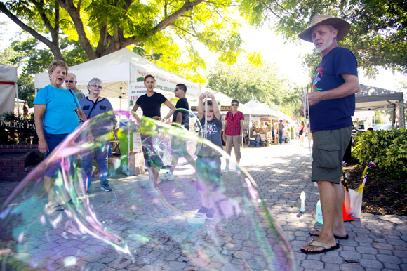 Waiting for the crossing signal to Pioneer Park, giant iridescent bubbles cross against traffic, drifting through the air from the Dunedin Downtown Market. Stiks, aka Brad Van Schoy, is the Bubble Man behind the overhead apparitions. Every week he drives from Gulfport to Dunedin for the market.