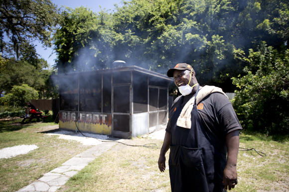 Eric Davis steps from the smokehouse wearing an apron and a towel draped over his shoulder and a savory cloud follows. George soon lands within a few feet of him. Davis began calling the great egret George years ago after a white bird by the same name in a story he heard as a child. Ever since they’ve both spent their weekends here hanging around the smokehouse adorned with faded flames and the word Bigfoot painted on the side.