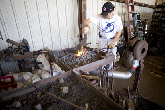 Using a foot pump, Christopher Miller fans a growing flame as his gloved hand plunges a gray steel shaft into glowing orange coals. After a minute or so, he pulls the smoldering steel and strikes it with a hammer on an anvil that sends the clanging sound resonating through the warehouse-like structure. The scene is reminiscent of Game of Thrones other than the Tampa Bay Lightning shirt Miller is sporting.