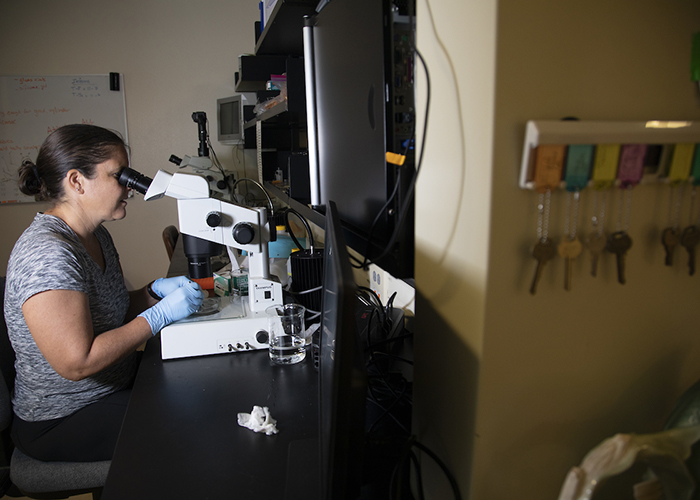 Julie Vecchio looks into a microscope at the University of South Florida College of Marine Science in St. Petersburg and deftly wields a set of tweezers.