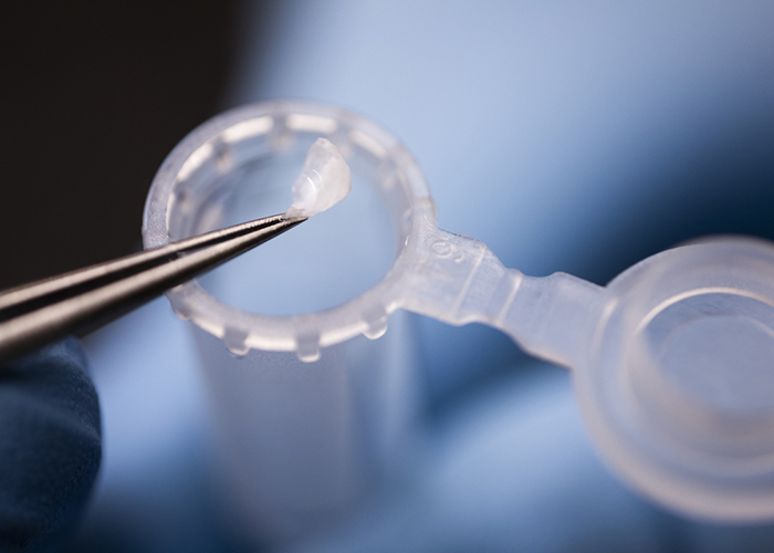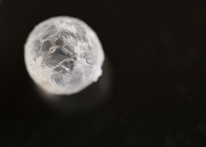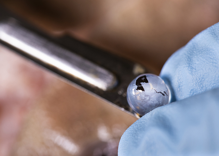 The fish eyes arrive frozen. Once they’ve been defrosted, Vecchio removes the lens, which is usually around 1 inch in diameter for fully mature fish. Then she separates the layers — the largest eyes can have up to 30 layers. The center of the eye is only 1/16 of an inch in diameter, so this task requires serious manual dexterity. Each layer goes into a small plastic tube, which is then dried overnight in an oven.