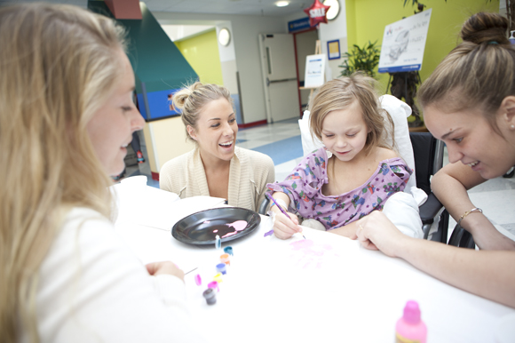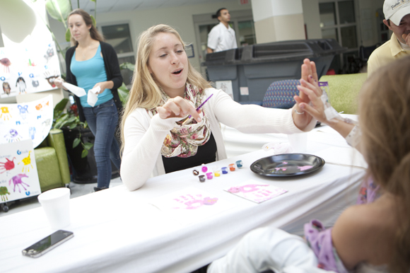 A patient at St. Joseph’s Children’s Hospital, Reagan joined in the fun as a half-dozen children and parents turned their handprints into butterflies, elephants, turtles, flamingos and even inch worms, part of an art project that now hangs in one of the new playrooms at the hospital.
