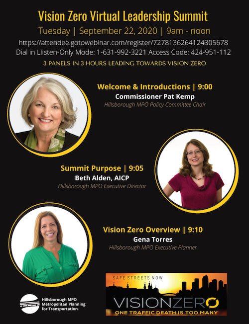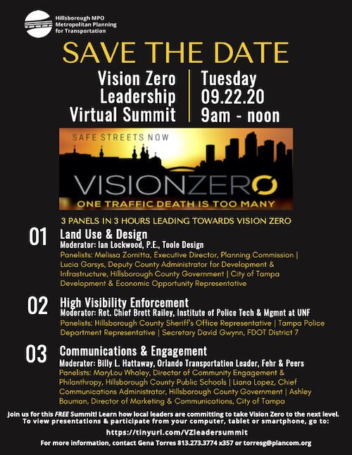 The Hillsborough Metropolitan Planning Organization and Vision Zero Hillsborough Coalition will host a virtual Vision Zero Leadership Summit on Tuesday morning, September 22. The free summit will feature moderators, panelists, and elected officials from the Planning Commission, Hillsborough County Government, City of Tampa, Hillsborough County Sheriff’s Office, Tampa Police Department, and Hillsborough County Public Schools.