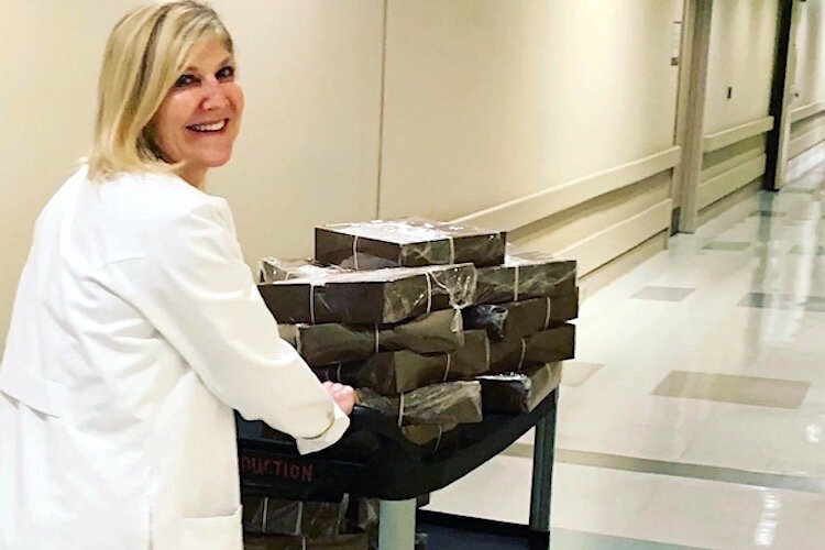 Owner Rachel Fine shares, “It’s giving me meaning right now. This is a devastating time for all of us. I don’t know how to solve this crisis, but I do know how to feed people. If I can put a smile on a nurse’s face, that’s what I’m hanging on to. That’s what’s keeping me going.”